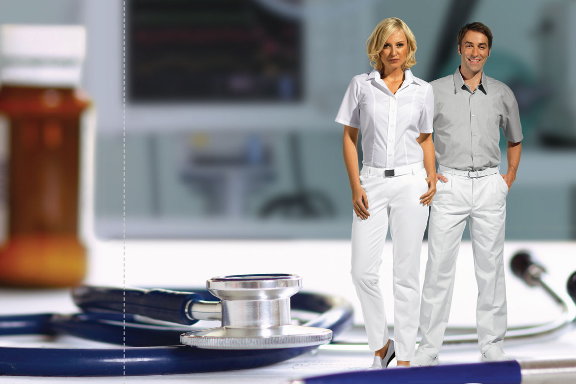 Speziell für Gesundheitszentren, Arztpraxen und Pflegedienste bieten wir ein Programm, das auf die Anforderungen im Dienste am Patienten zugeschnitten ist. Zweckmäßigkeit, pfl egeleichte strapazierfähige Materialien und ansprechende Optik schließen sich dabei nicht aus. Die meisten Krankenhäuser haben, ebenso wie die Pflegedienste, ein durchdachtes Corporate Design, das sich nicht zuletzt in der Dienstkleidung wiederfinden muss.